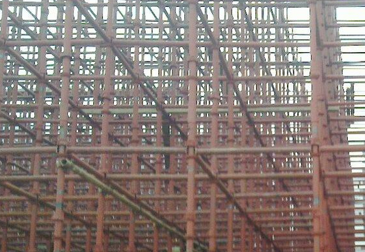 由于該工程施工工期緊,難度大,質(zhì)量要求高,但為了確保11731交安和12630中交目標(biāo)的實(shí)現(xiàn),對(duì)高度9m和19m處的框架梁采用鋼管腳手架作支撐,施工規(guī)范“腳手架結(jié)構(gòu)模板支撐架的構(gòu)造和設(shè)計(jì)”中明確規(guī)定要求:采用腳手架桿配件搭設(shè)模板支撐架是常用的施工方法之一。
